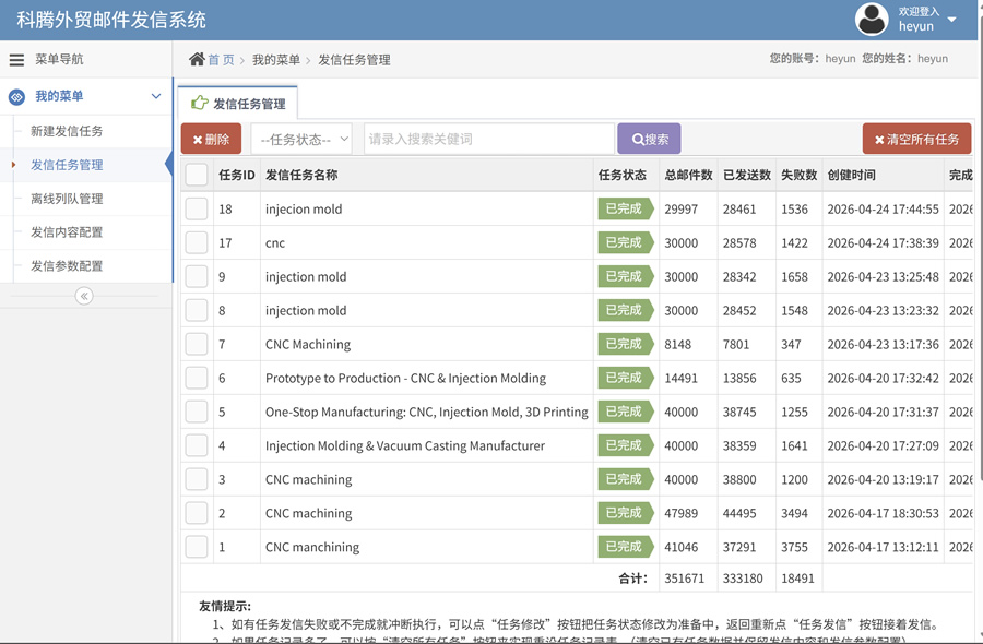 新建发信任务和收件地址导入,一次可导入几万地址。