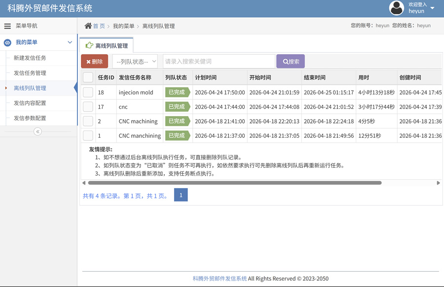 2. 支持无人工离线执行发信任务,自定义发信模版,定义好任务时间到系统自动启动发信。