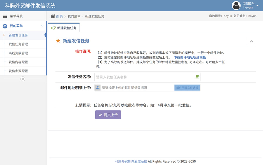 新建发信任务和收件地址导入,一次可导入几万地址。