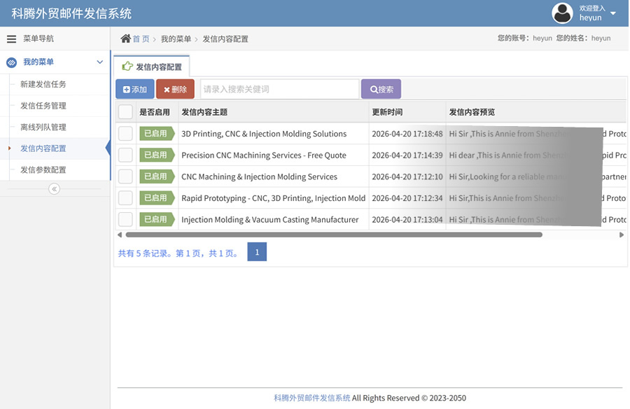 2. 支持无人工离线执行发信任务,自定义发信模版,定义好任务时间到系统自动启动发信。