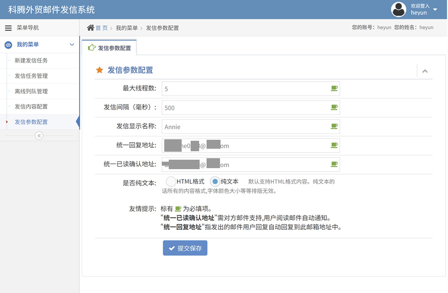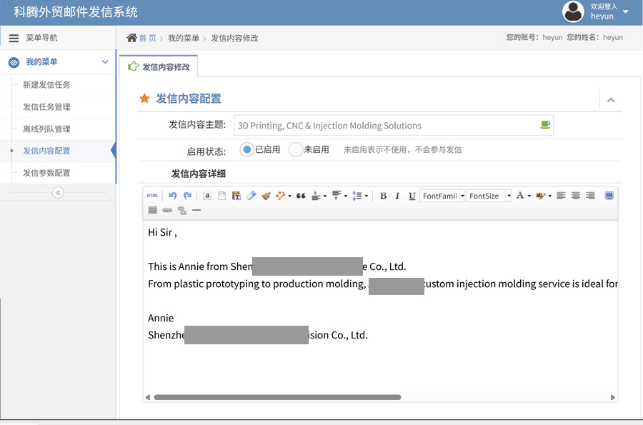 ——专为外贸人员开发客户用的电子邮箱营销系统,自配专用服务器, 不受邮局服务器限制,定义好邮件模版后可定时启动任务自动发信。